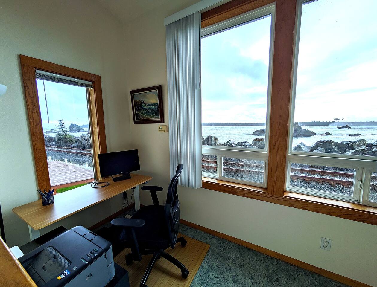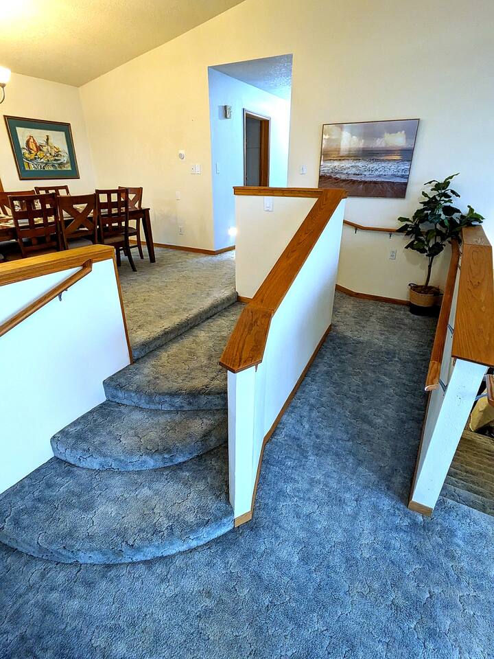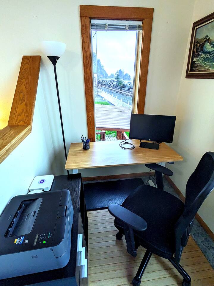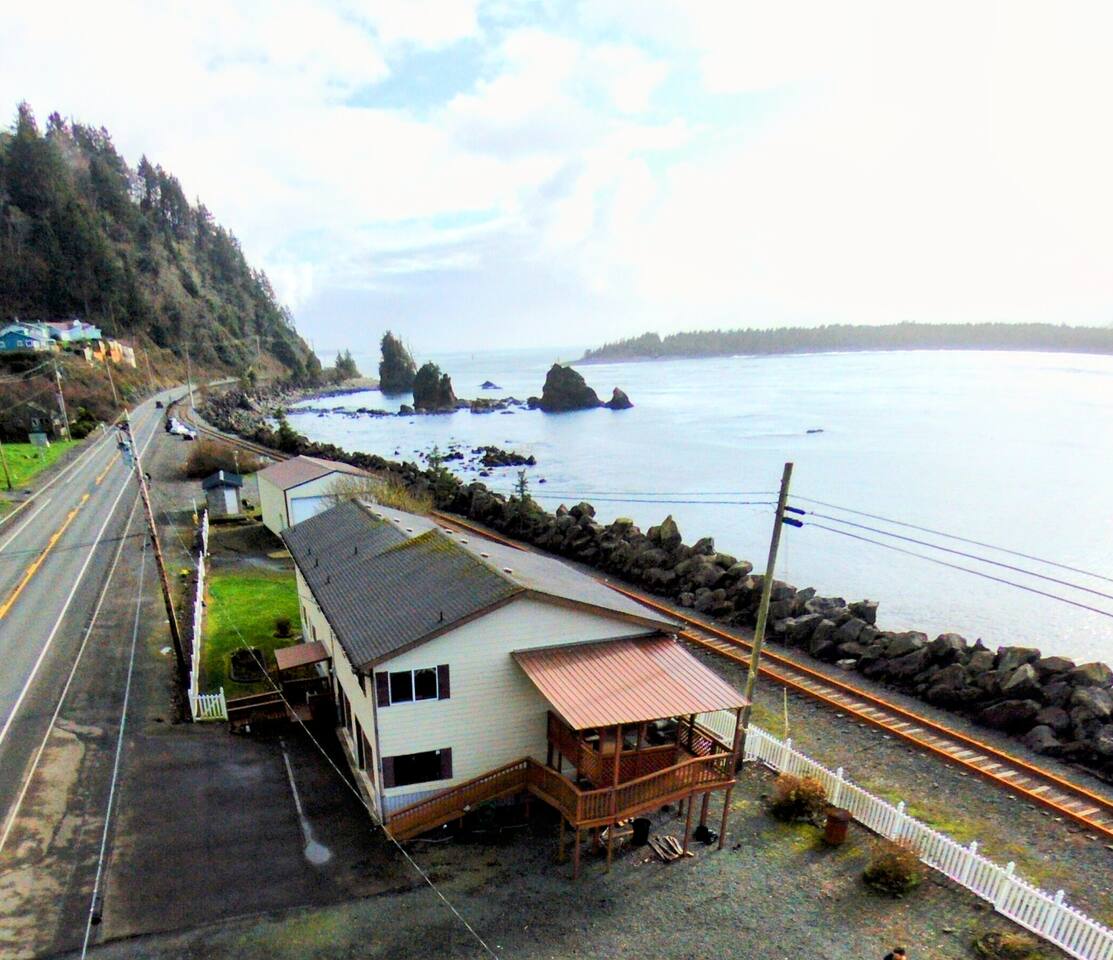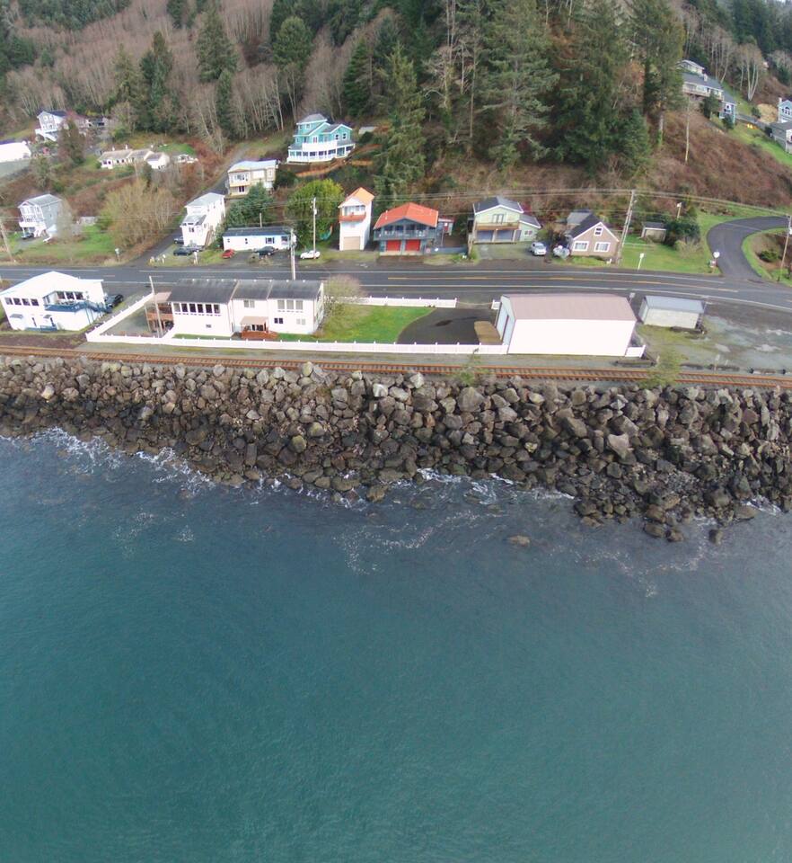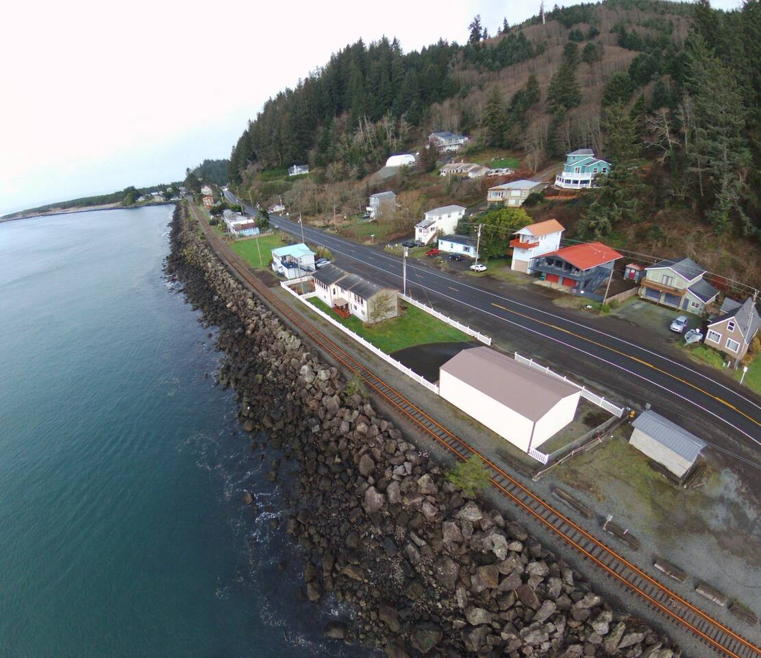 At King Tide BNB, there’s room for everyone — and everything. Bring your boat, trailer, toys, and cars. With plenty of parking, this home is the perfect base for fishing trips, crabbing adventures, or family gatherings on the bay. This large 5-bedroom, 3-bathroom retreat was originally designed to be an accessible residence, featuring wide hallways, spacious doorways, and ramps that make the home feel welcoming and easy to navigate for all generations. Inside you’ll find a fully equipped kitchen with a coffee bar, a sit/stand desk with bay views for those who need to balance work and play, and a huge primary suite with floor-to-ceiling windows and a private deck for soaking in the scenery. The layout is ideal for groups: upstairs has 2 bedrooms, 2 bathrooms, plus the kitchen, dining, and living areas. Downstairs has 3 bedrooms, 1 bathroom, and a second living and dining space for extra flexibility. Adding to the charm, a seasonal Oregon Coast Scenic Railway train runs between the home and the bay. Families love watching it pass by, and many guests hop aboard for the classic ride from Garibaldi to Rockaway Beach. The train runs a few times a day in spring and summer during daylight hours, with a one-hour stop in Rockaway for shopping, food, or ice cream.