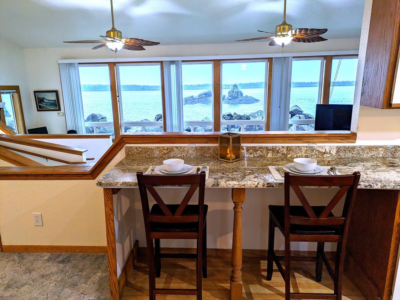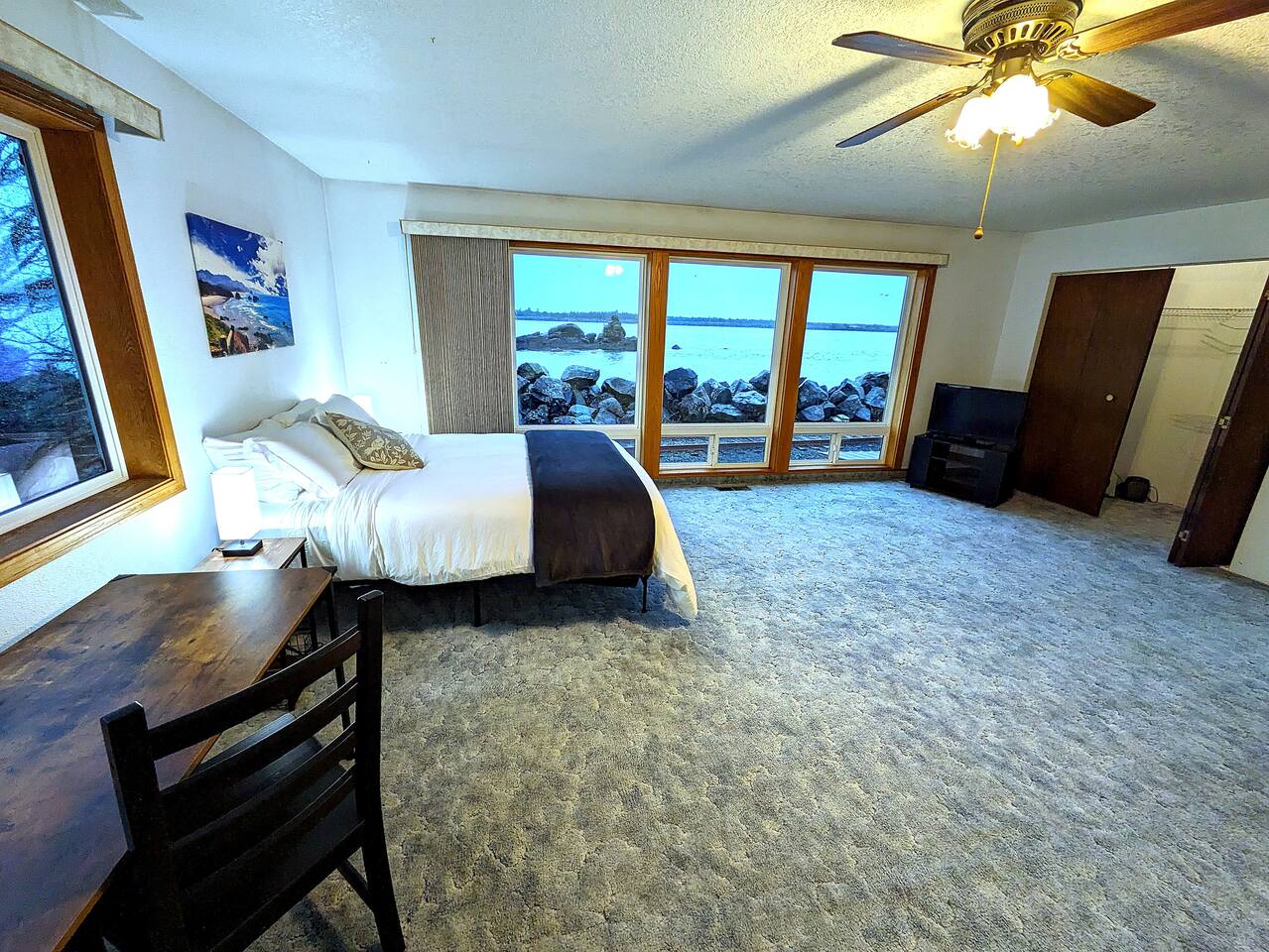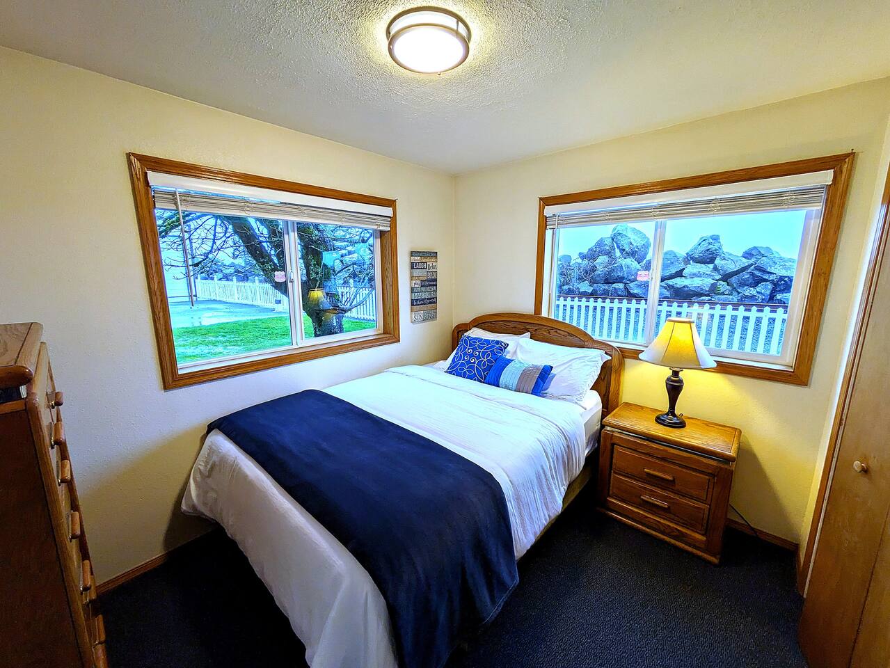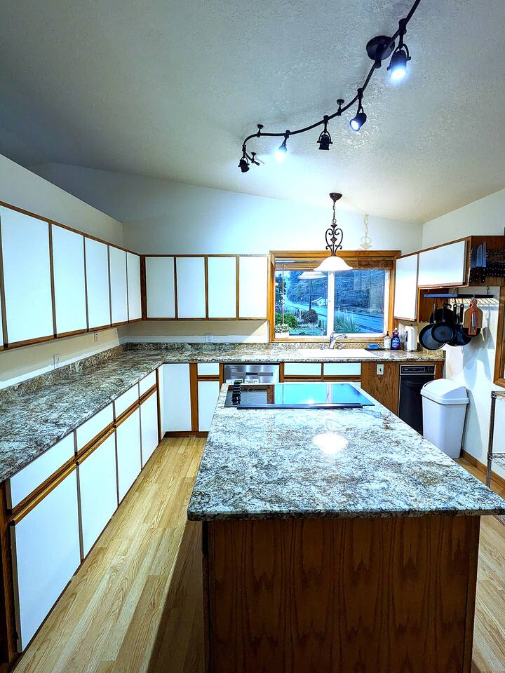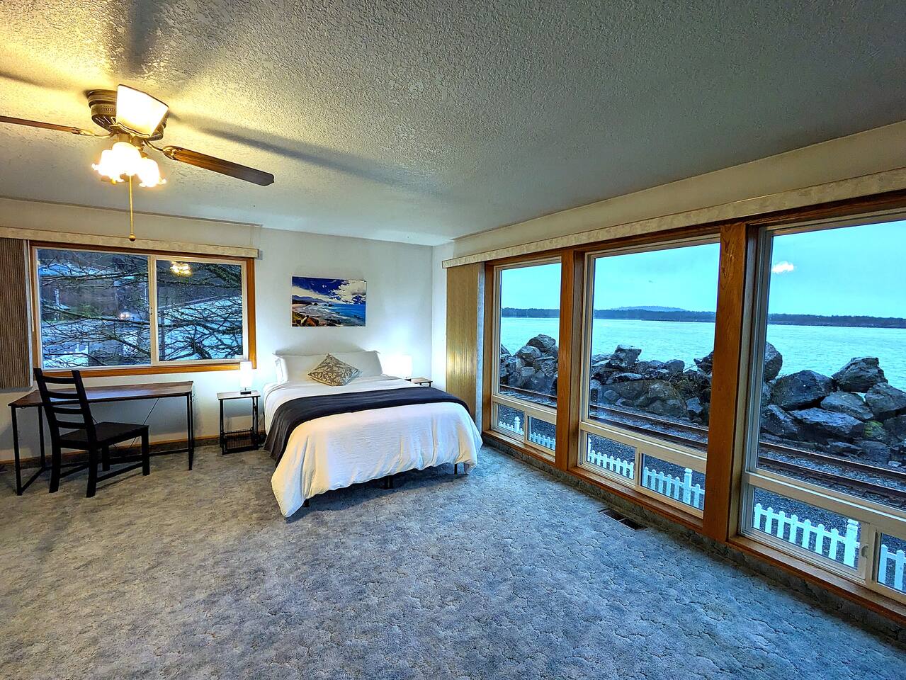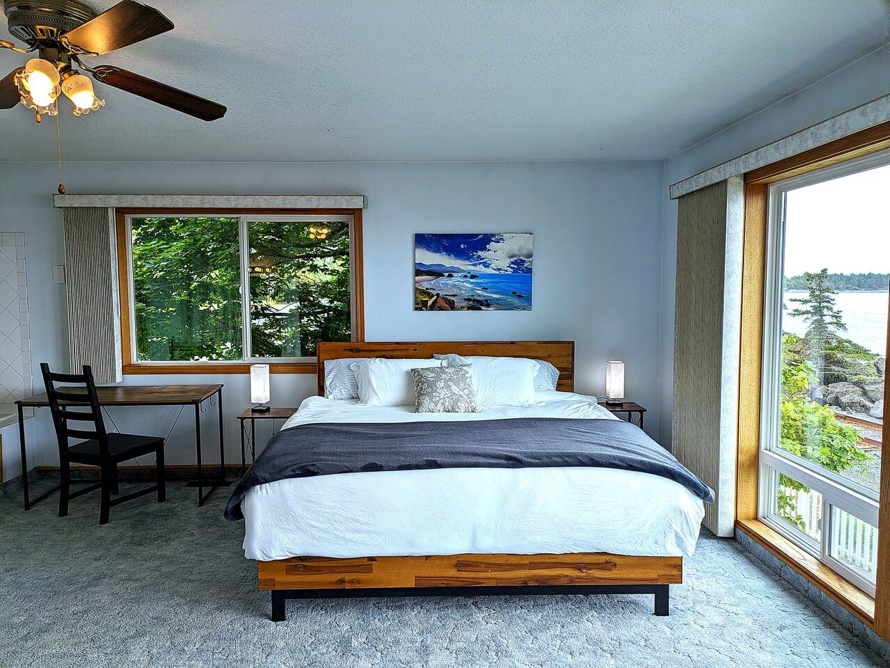 At King Tide BNB, there’s room for everyone — and everything. Bring your boat, trailer, toys, and cars. With plenty of parking, this home is the perfect base for fishing trips, crabbing adventures, or family gatherings on the bay. This large 5-bedroom, 3-bathroom retreat was originally designed to be an accessible residence, featuring wide hallways, spacious doorways, and ramps that make the home feel welcoming and easy to navigate for all generations. Inside you’ll find a fully equipped kitchen with a coffee bar, a sit/stand desk with bay views for those who need to balance work and play, and a huge primary suite with floor-to-ceiling windows and a private deck for soaking in the scenery. The layout is ideal for groups: upstairs has 2 bedrooms, 2 bathrooms, plus the kitchen, dining, and living areas. Downstairs has 3 bedrooms, 1 bathroom, and a second living and dining space for extra flexibility. Adding to the charm, a seasonal Oregon Coast Scenic Railway train runs between the home and the bay. Families love watching it pass by, and many guests hop aboard for the classic ride from Garibaldi to Rockaway Beach. The train runs a few times a day in spring and summer during daylight hours, with a one-hour stop in Rockaway for shopping, food, or ice cream.