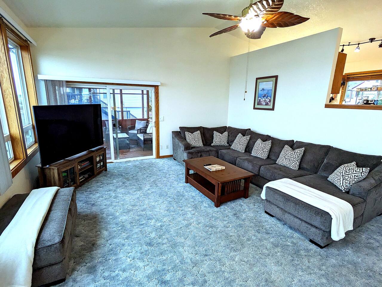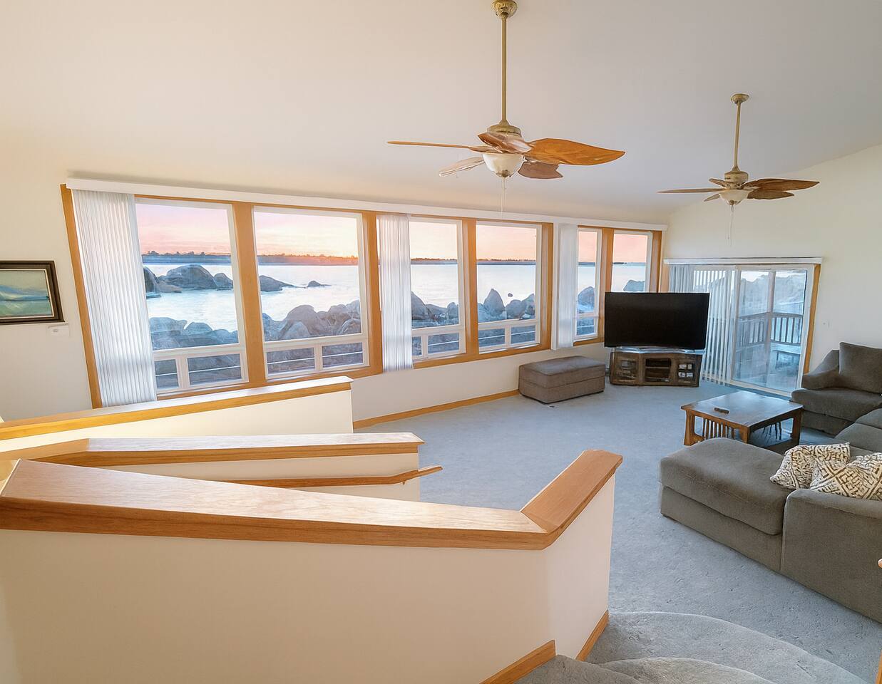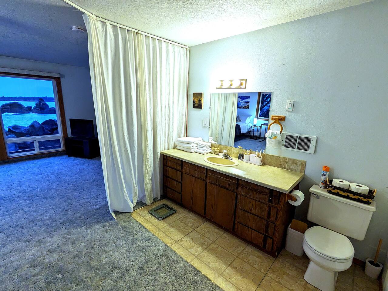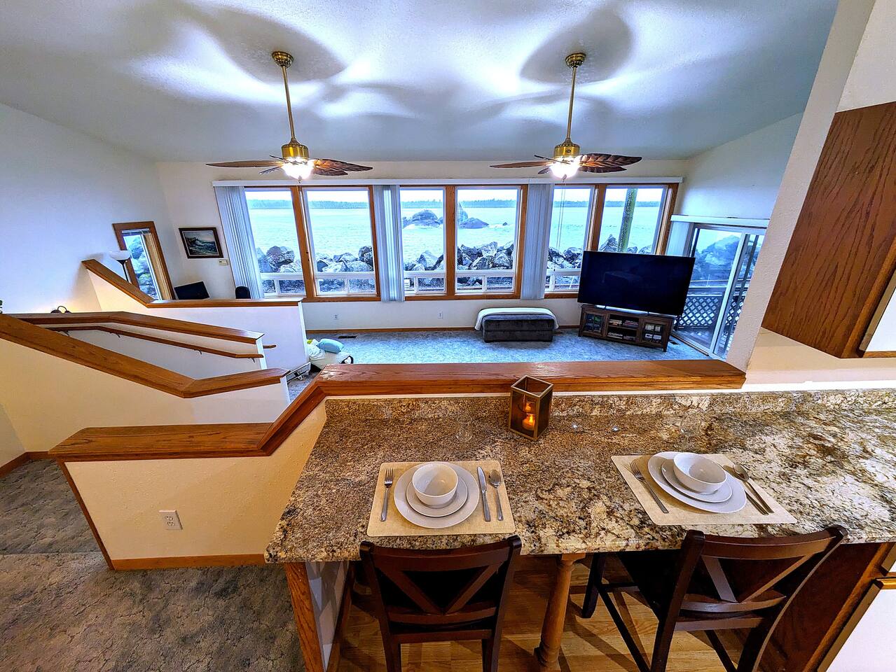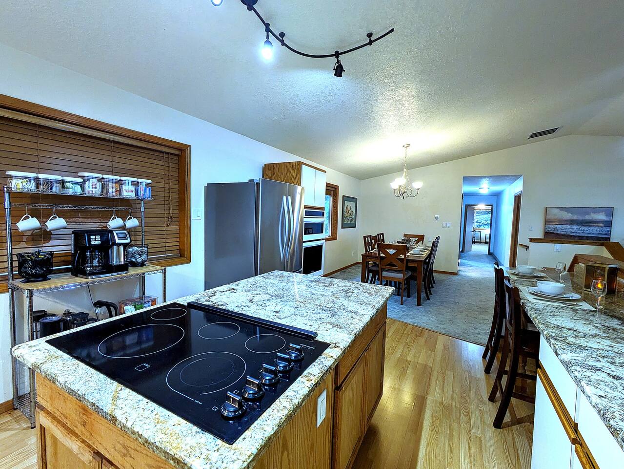 At King Tide BNB, there’s room for everyone — and everything. Bring your boat, trailer, toys, and cars. With plenty of parking, this home is the perfect base for fishing trips, crabbing adventures, or family gatherings on the bay. This large 5-bedroom, 3-bathroom retreat was originally designed to be an accessible residence, featuring wide hallways, spacious doorways, and ramps that make the home feel welcoming and easy to navigate for all generations. Inside you’ll find a fully equipped kitchen with a coffee bar, a sit/stand desk with bay views for those who need to balance work and play, and a huge primary suite with floor-to-ceiling windows and a private deck for soaking in the scenery. The layout is ideal for groups: upstairs has 2 bedrooms, 2 bathrooms, plus the kitchen, dining, and living areas. Downstairs has 3 bedrooms, 1 bathroom, and a second living and dining space for extra flexibility. Adding to the charm, a seasonal Oregon Coast Scenic Railway train runs between the home and the bay. Families love watching it pass by, and many guests hop aboard for the classic ride from Garibaldi to Rockaway Beach. The train runs a few times a day in spring and summer during daylight hours, with a one-hour stop in Rockaway for shopping, food, or ice cream.